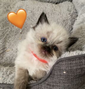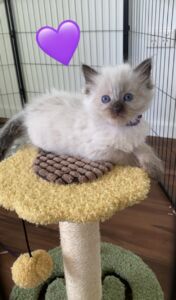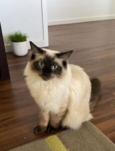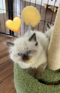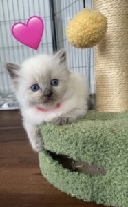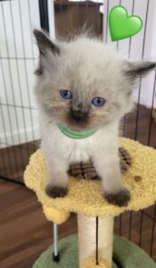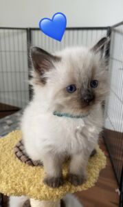 Cleo is our stunning blue point Queen. She is the quietest, most gentle soul. She loves nothing more than cuddling up on the couch and PURRRSSS constantly. Cleo is a slender and agile build with stunning blue eyes.